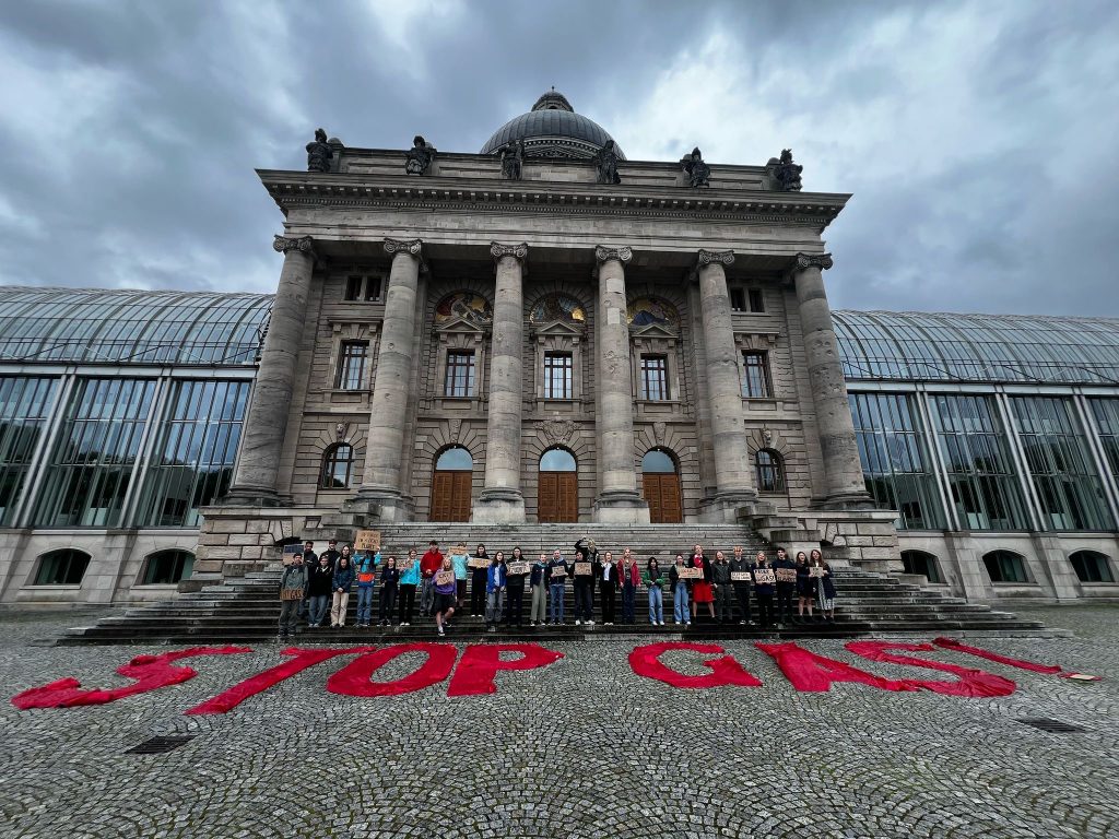 Bereits seit einem Jahr protestieren Anwohner*innen und Naturschützer*innen gegen die umstrittene Gasbohrung. Anfang Mai waren mehr als 1.200 Menschen vor Ort, um ein klares Zeichen gegen die Förderung von klimaschädlichen Erdgas in Bayern zu protestieren. Vergangenes Wochenende, als der Aufbau des Bohrturm begann, demonstrierten rund 60 Menschen am Bohrplatz. In München legten am Montag Aktivist*innen von Fridays for Future einen mehrere Meter hohen Schriftzug aus rotem Stoff „Stop Gas!“ vor die Staatskanzlei.